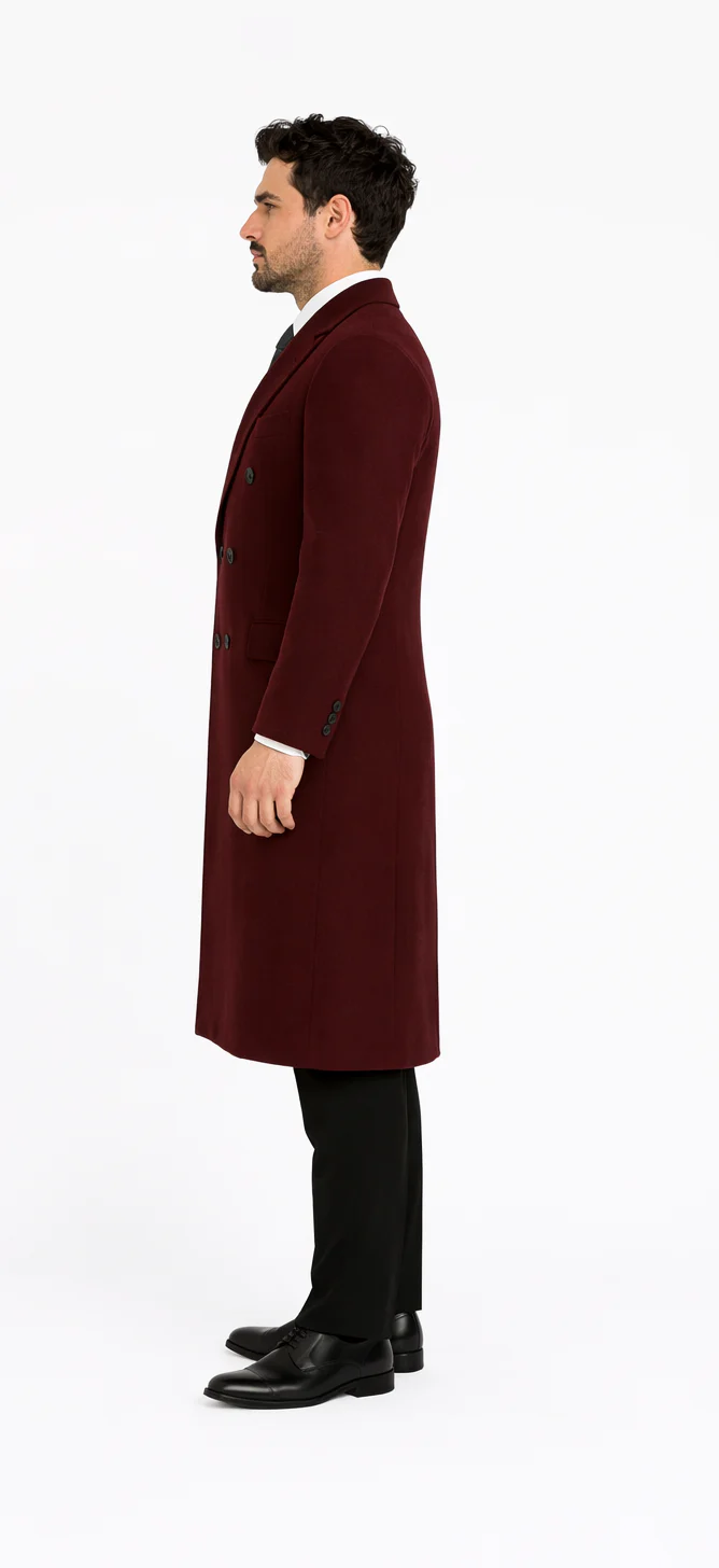 The rich dark burgundy shade offers a bold yet refined statement, exuding confidence, authority, and individuality. Its deep tone captures the essence of classic European fashion—perfect for formal occasions, business meetings, weddings, and elegant winter outings. This overcoat’s elongated silhouette creates a commanding presence, enhancing posture while maintaining a clean, structured drape that flatters every physique.