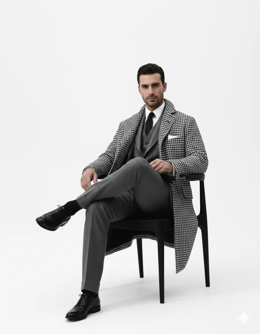 The black and white checker pattern is timeless and versatile, allowing the overcoat to be paired with a variety of outfits.