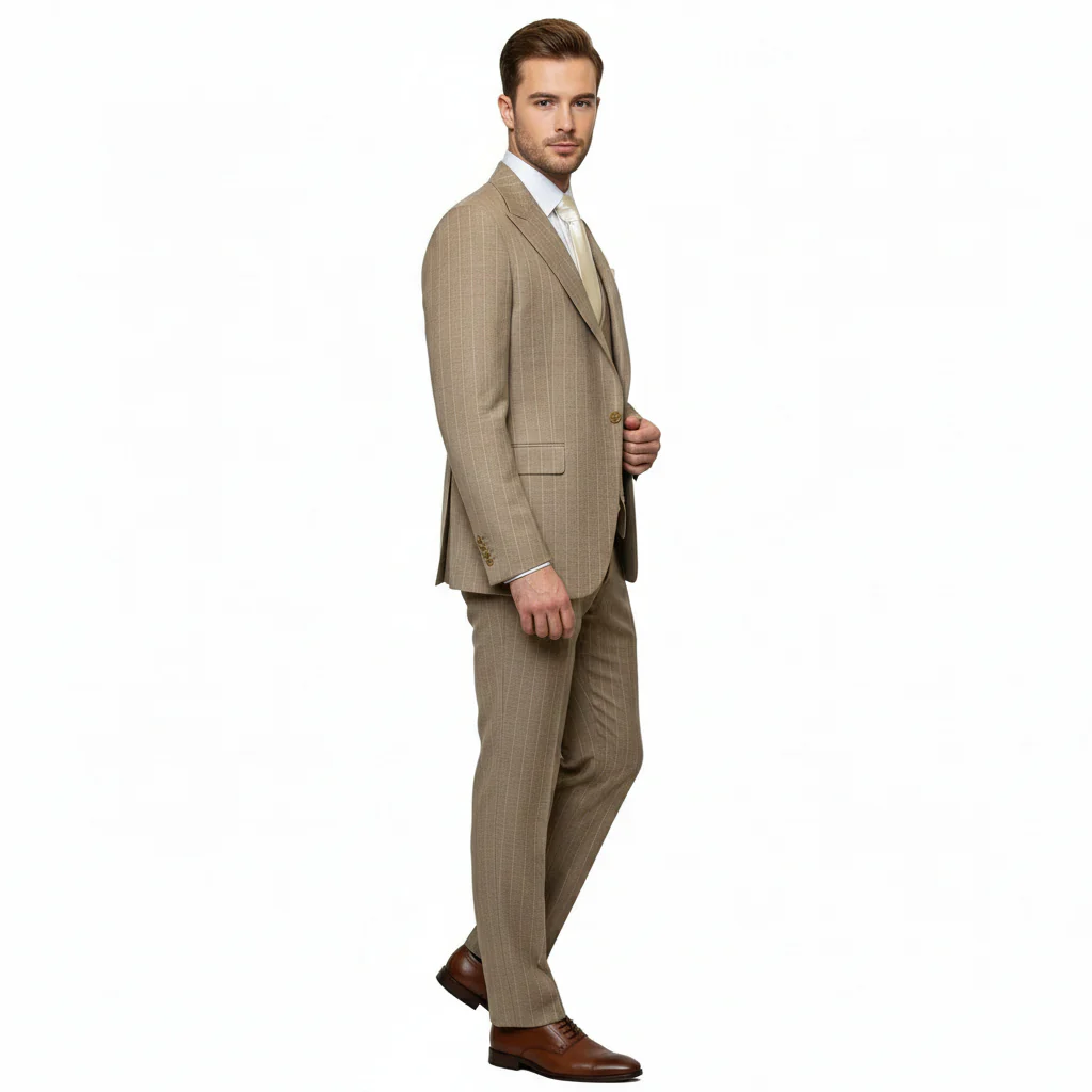 Men’s Beige Pinstripe Three-Piece Suit – Classic Fit Formal Suit with Vest and Flat-Front Pants in Tan Stripe By Rossiman