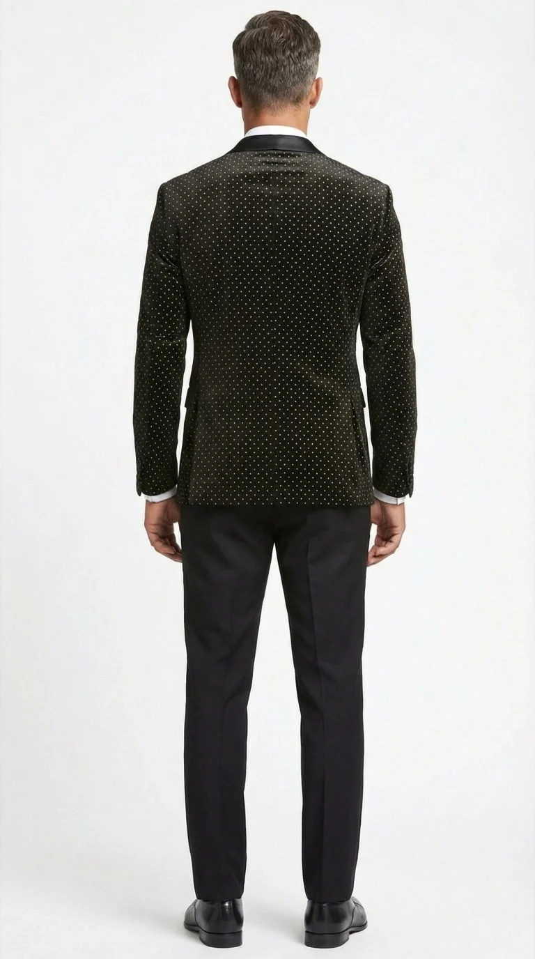 Men’s Black Velvet Dinner Jacket Blazer with Satin Lapel – Formal Evening Tuxedo Style Jacket Polk Dots Pattern + Free bowtie