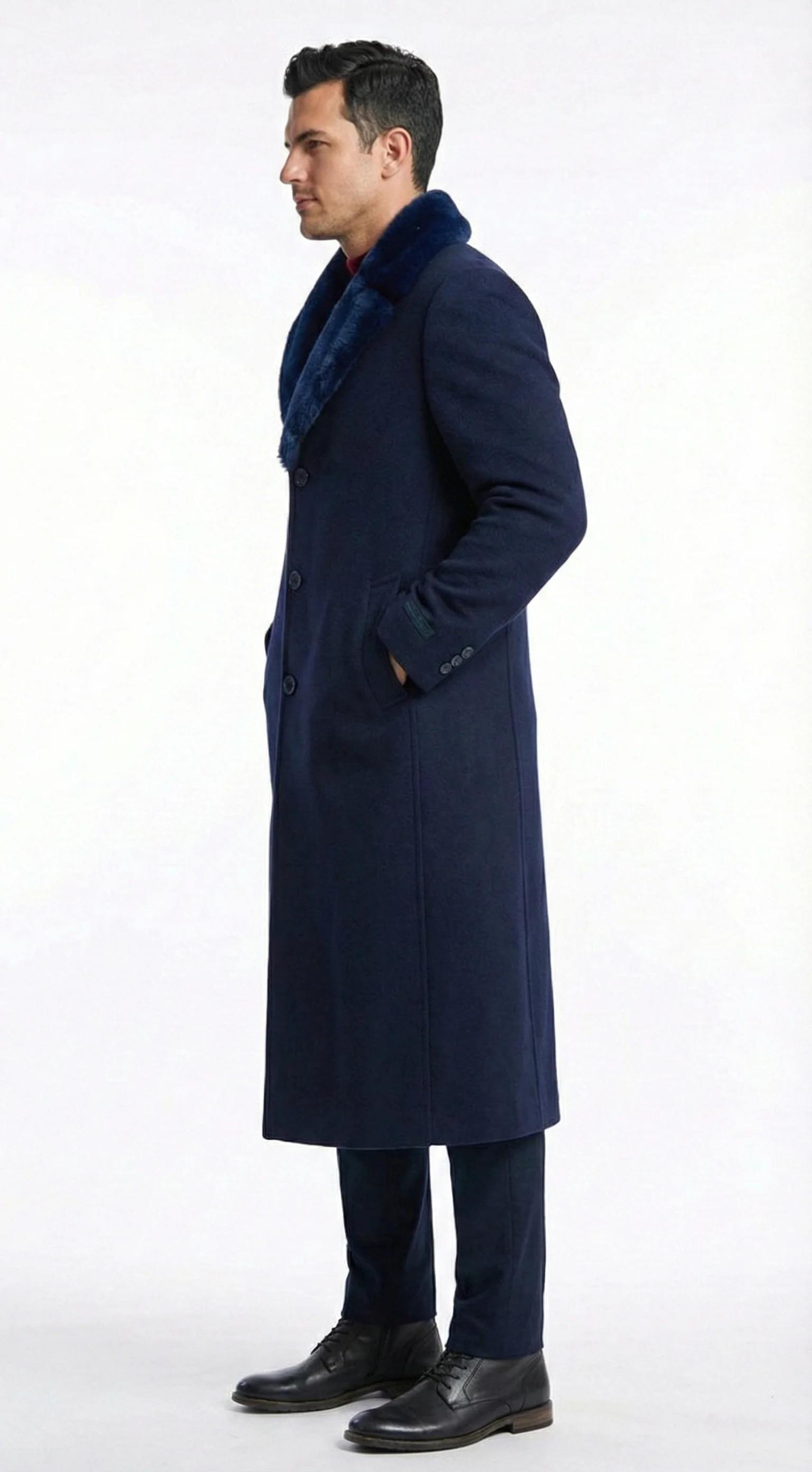 Men’s Dark Navy Blue Long Overcoat with Faux Fur Collar, Classic Winter Dress Coat for Formal