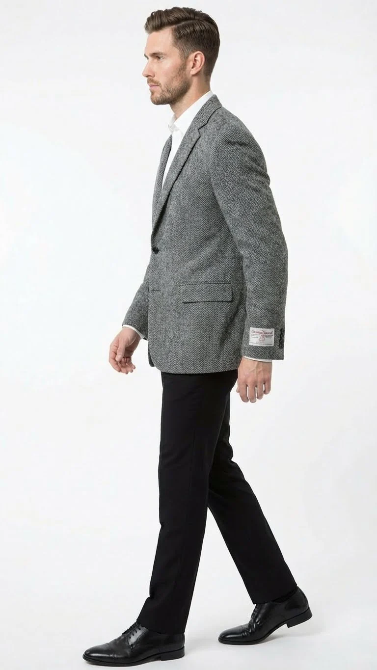 Men’s Grey Harris Tweed Blazer Jacket, Classic Herringbone Wool Sport Coat for Business Casual