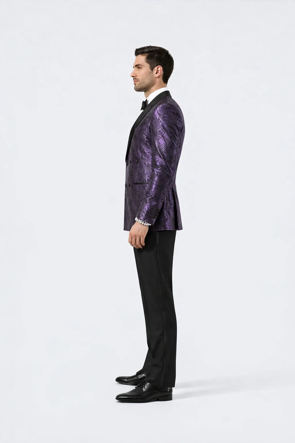 This purple jacquard tuxedo jacket pairs effortlessly with black tuxedo trousers, tailored dress pants, or formal slacks. It complements a crisp white dress shirt, black bow tie or satin necktie, pocket square, and polished dress shoes, allowing versatile styling for weddings, proms, and luxury evening events. Whether worn as part of a full tuxedo ensemble or styled as a standout formal blazer, it delivers undeniable sophistication.