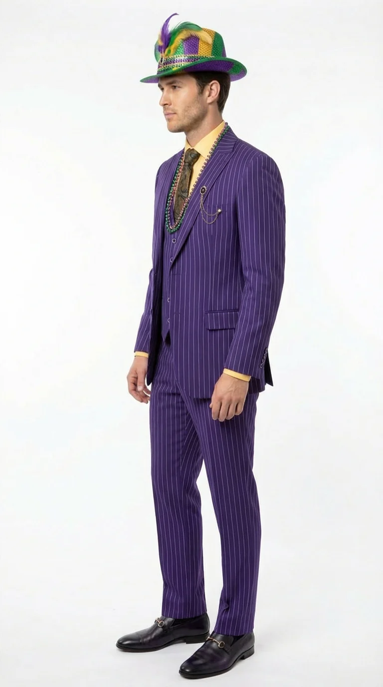 Stand out in bold festive style with this men’s purple pinstripe Mardi Gras suit, designed specifically for celebrations, parades, and statement-making events. Featuring a rich purple color accented with clean pinstripe detailing, this suit delivers a classic look with strong Mardi Gras character.