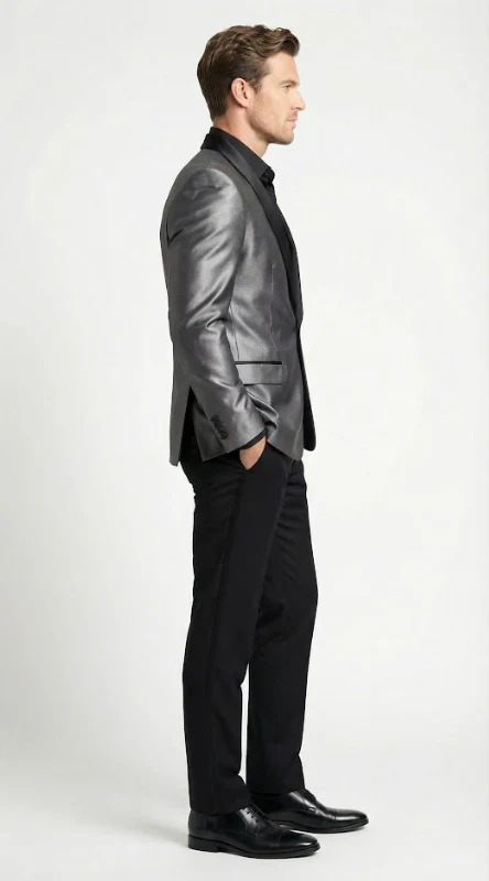 Featuring a sleek shiny charcoal exterior with a contrasting black lapel, this men’s charcoal formal blazer jacket offers a structured silhouette, classic single-button closure, and clean tailored detailing. The versatile charcoal color makes it an excellent choice for party wear, evening events, weddings, receptions, stage performances, and fashion-forward gatherings.