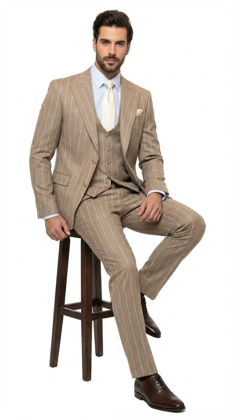 Upgrade your formal wardrobe with this Men's Beige Pinstripe Three-Piece Suit, designed for a polished, modern, and distinguished appearance. Crafted with a refined beige fabric featuring subtle white pinstripes, this suit offers a timeless yet contemporary look suitable for weddings, business meetings, evening events, and formal occasions.