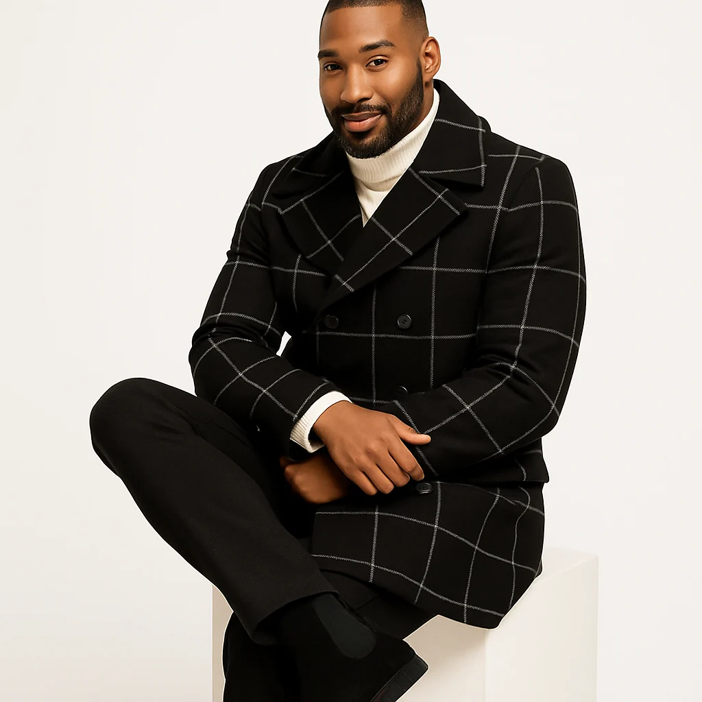 Mens Black Windowpane Check Wool Overcoat – Double-Breasted Winter Peacoat