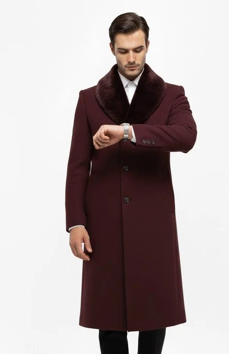 Absolutely stunning coat! The burgundy shade is deep and elegant, and the fur collar feels incredibly soft and luxurious. It fits perfectly over my suit and keeps me warm without feeling bulky. Excellent craftsmanship and attention to detail. – Michael