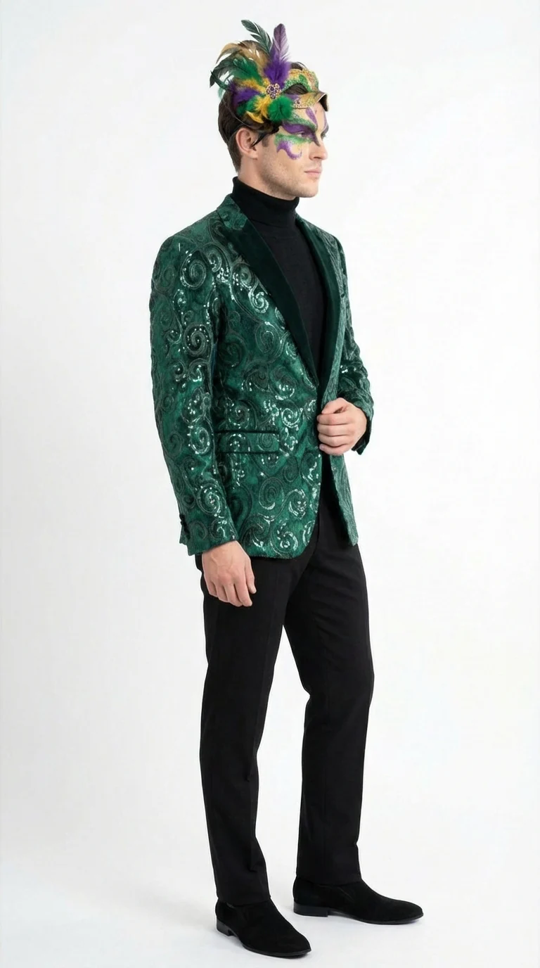 The textured green fabric adds depth and shine, making it an ideal choice for Mardi Gras events, carnival parties, themed celebrations, prom, stage performances, weddings, and formal evening occasions. The black satin lapel enhances the formal appeal while creating a sharp contrast against the vibrant green base.