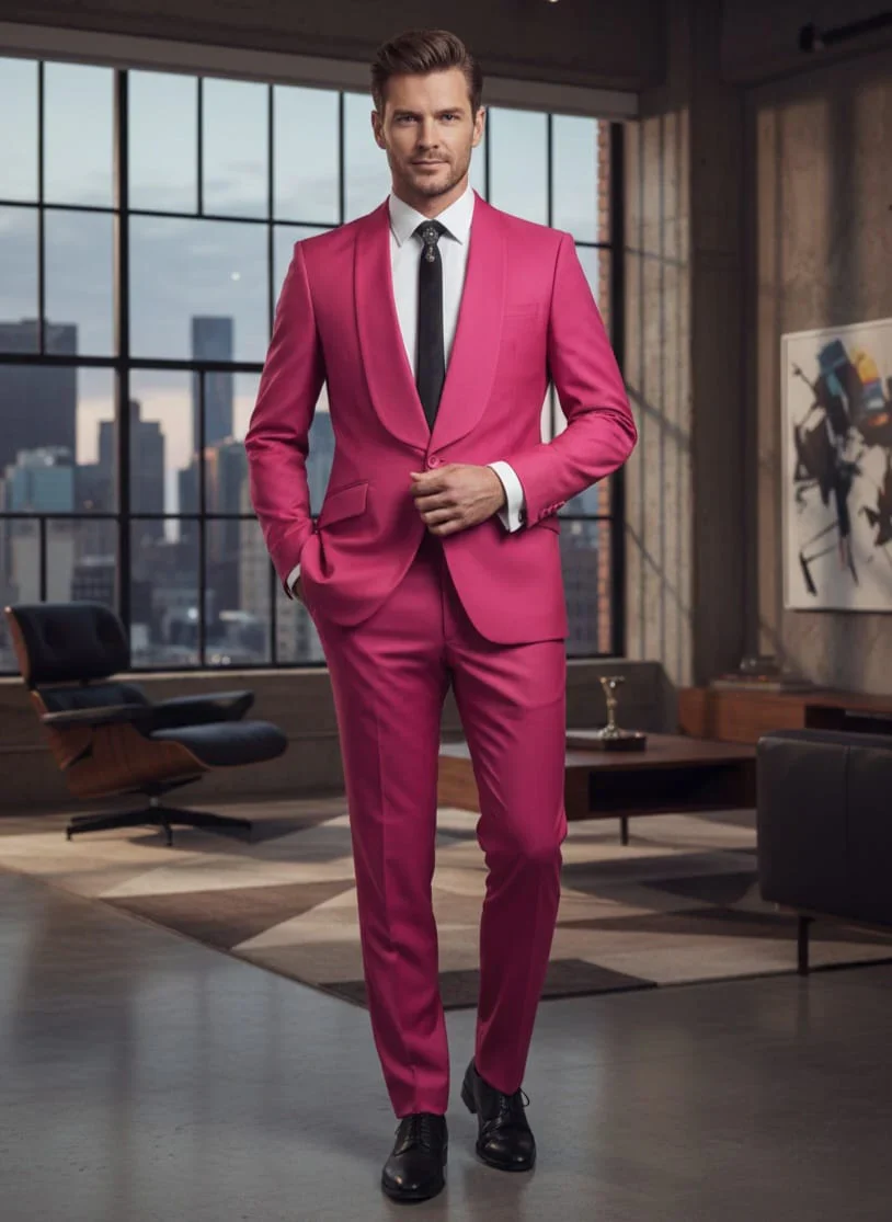 Mens Fuchsia Pink 2-Piece Slim Fit Suit – 1 Button Shawl Lapel with Flat Front Pants