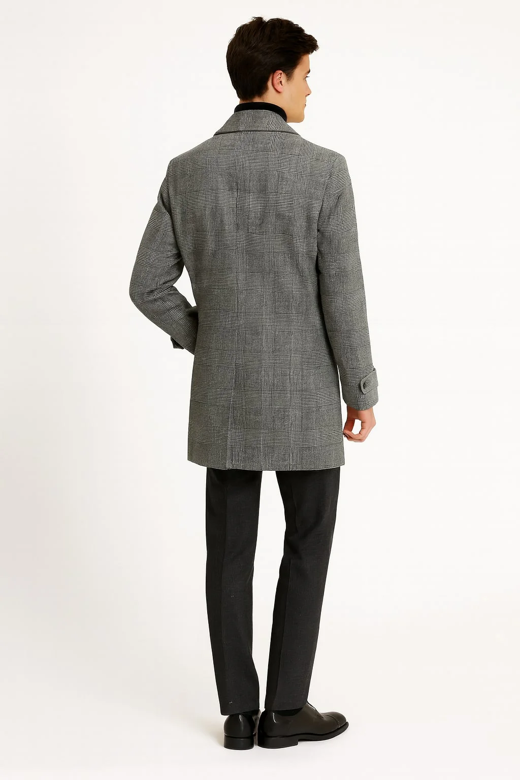 Step into timeless elegance with this men’s grey plaid double-breasted overcoat, crafted from a premium wool-blend fabric that delivers both warmth and sophistication. Featuring a classic Prince of Wales check pattern, this coat is designed for the modern gentleman who values style and practicality.