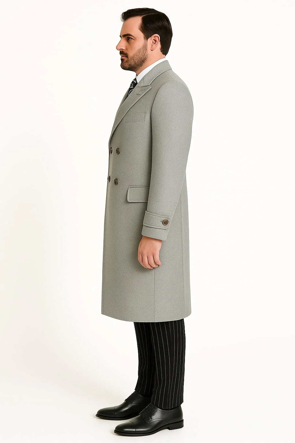 Crafted from a high-quality wool blend, this coat features a double-breasted design with peak lapels, detailed metallic buttons, and flap pockets for added function and form. The full-length cut and structured fit make it ideal for formal wear, church attire, or business layering. Its versatile light gray hue pairs effortlessly with both suits and dress slacks, making it a must-have staple in any refined wardrobe.