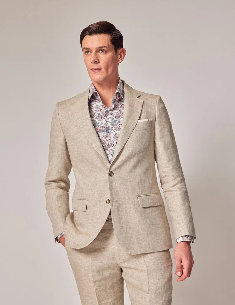 Mens Linen Suit For Beach Wedding - Summer Suit in Natural Herringbone Tailored Fit