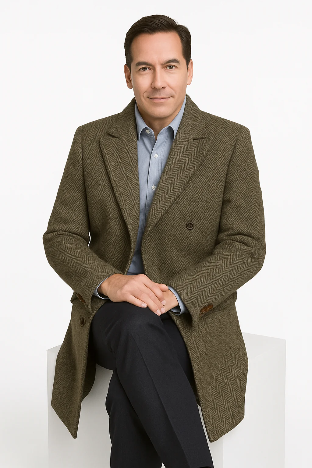 Mens Long Herringbone Wool Overcoat – Classic Double-Breasted Winter Topcoat
