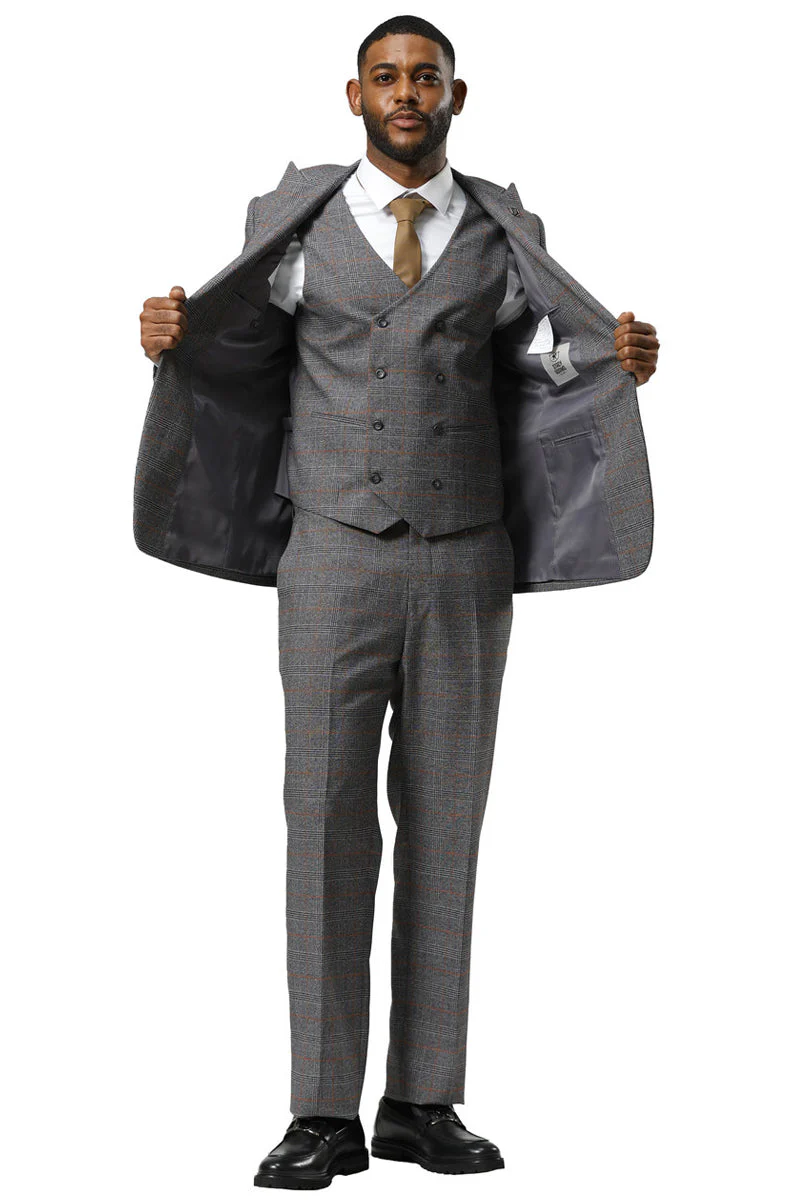 Men's Stacy Adams One Button Peak Lapel Suit With Double Breasted Vest in Grey Glen Plaid