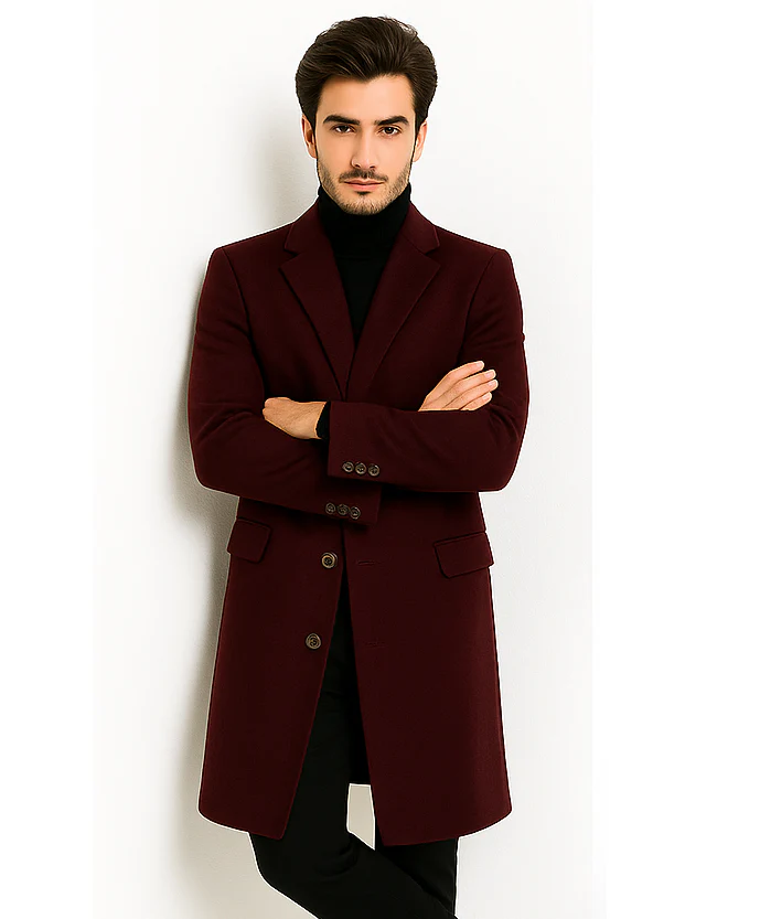 The rich burgundy hue gives this coat its commanding character. Deep, warm, and luxurious, it’s a shade that conveys confidence and individuality—perfect for men who like to stand apart while remaining effortlessly polished. Whether you’re heading to the office, attending an evening event, or stepping out for a winter stroll, this coat transforms your look from ordinary to extraordinary.
