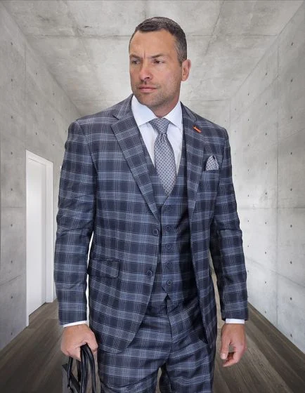 Statement Men’s 3-Piece 100% Wool Modern Fit Suit – Sharp Plaid Pattern