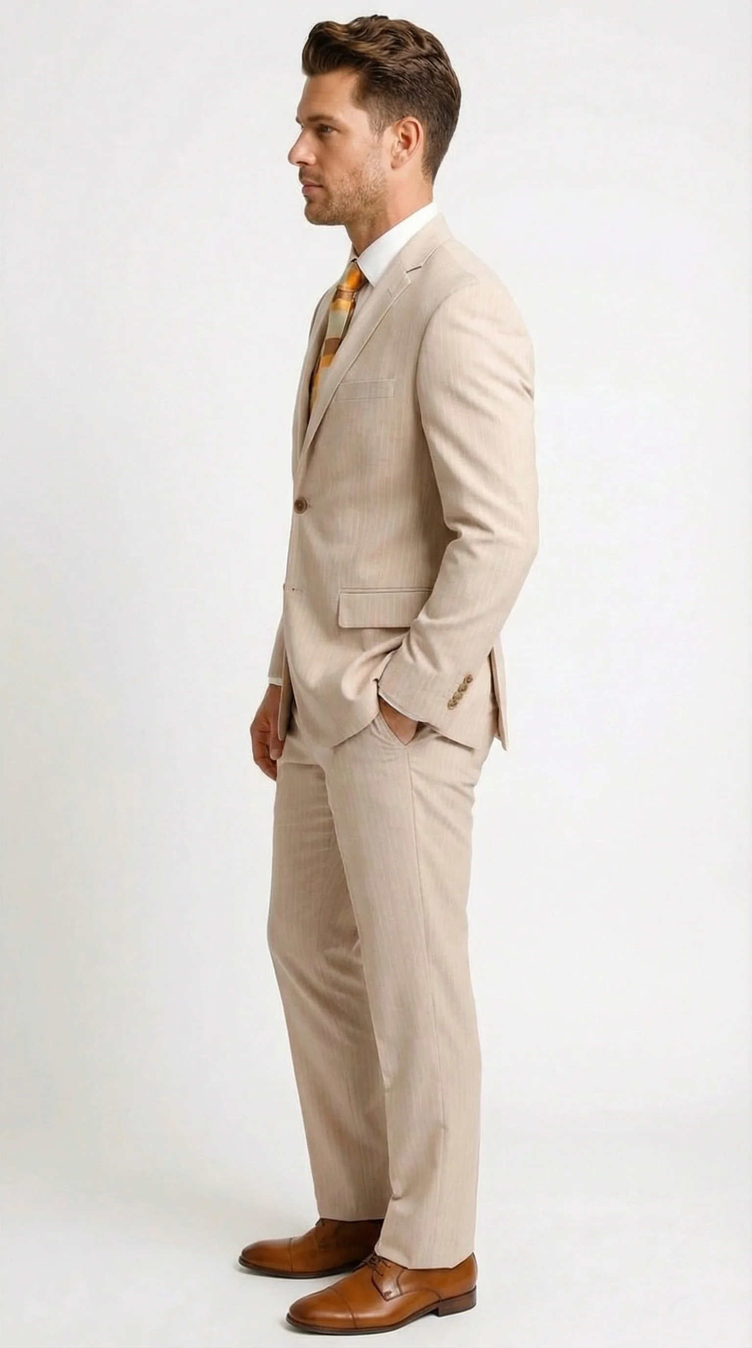 This men’s natural beige formal suit is a smart choice for anyone looking to achieve a professional, elegant, and confident appearance.